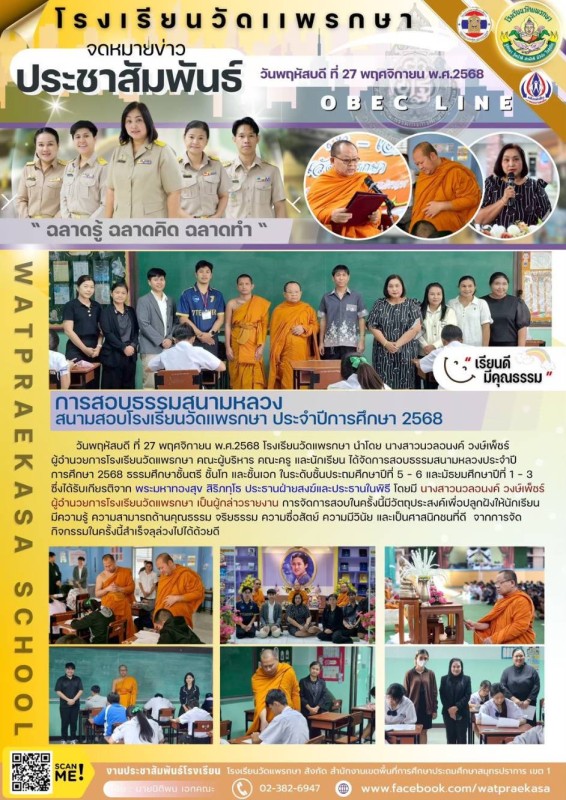การสอบธรรมศึกษาสนามหลวง สนามสอบโรงเรียนวัดแพรกษา ปีการศึกษา 2568